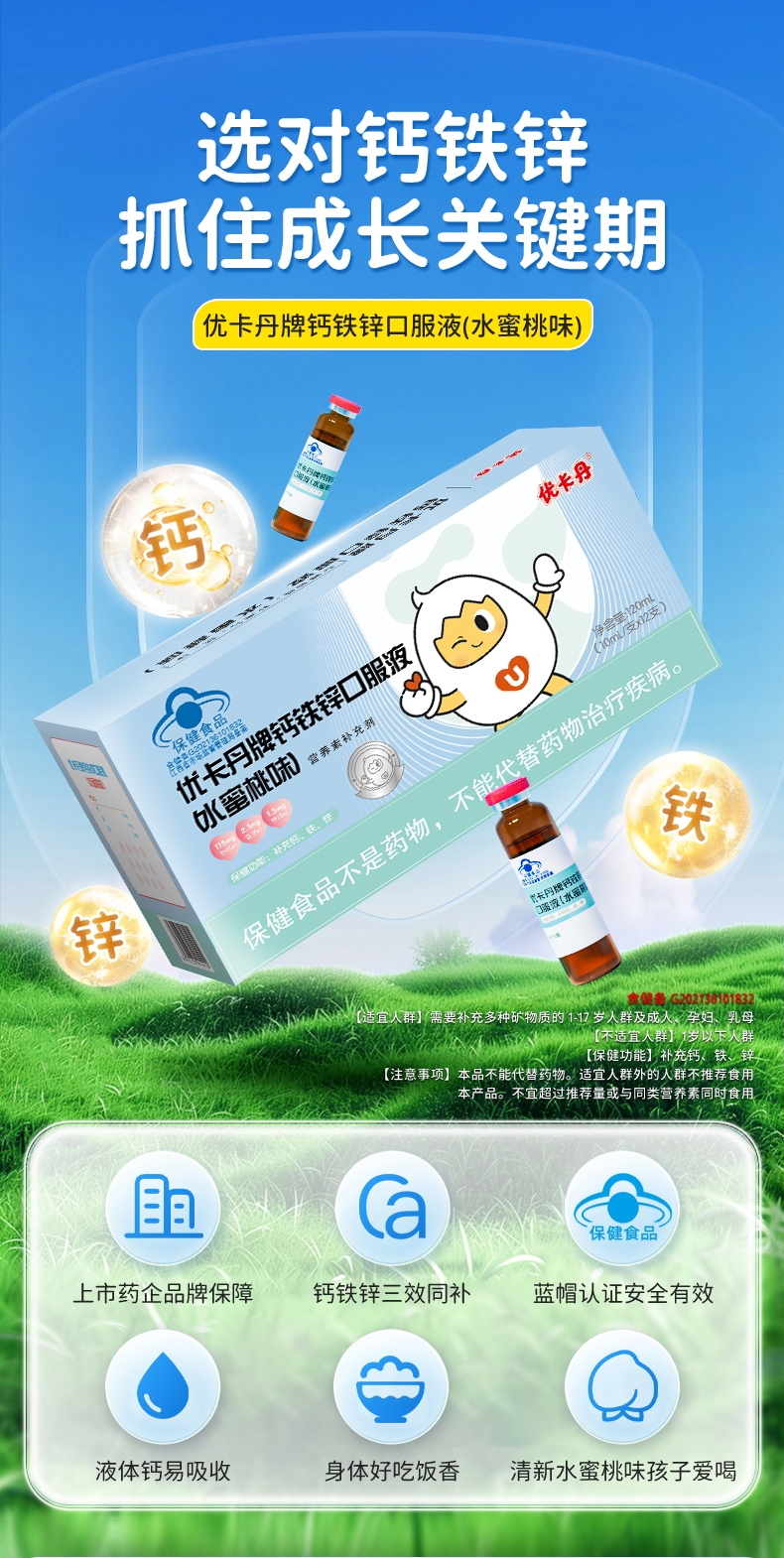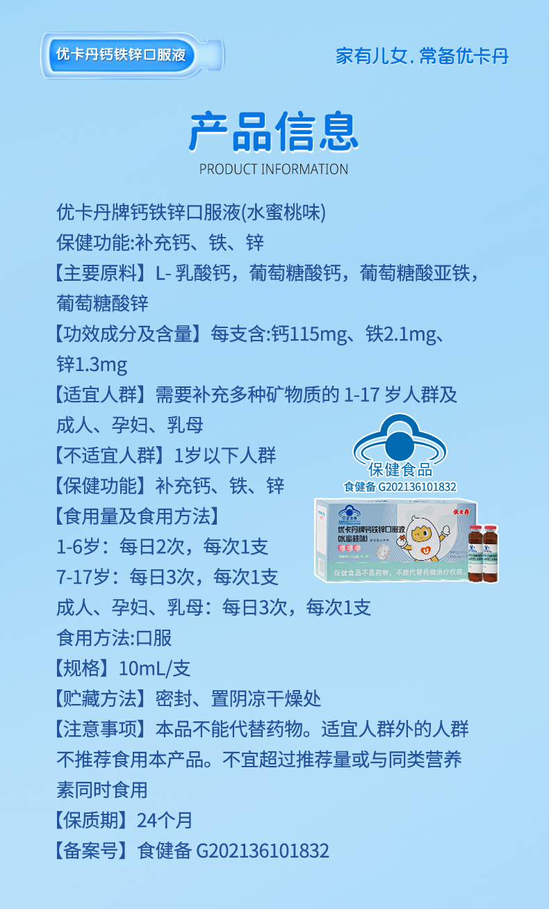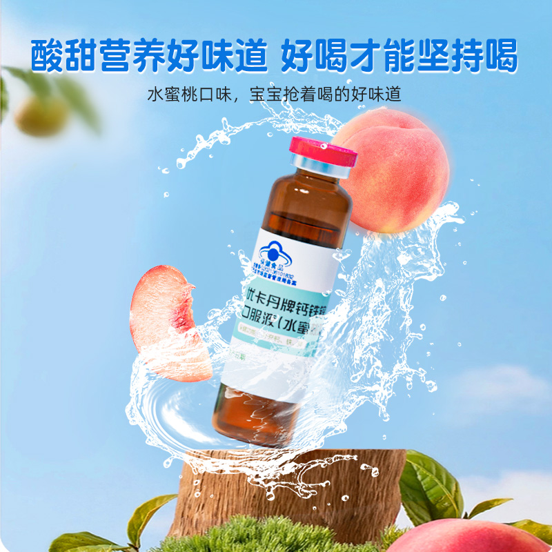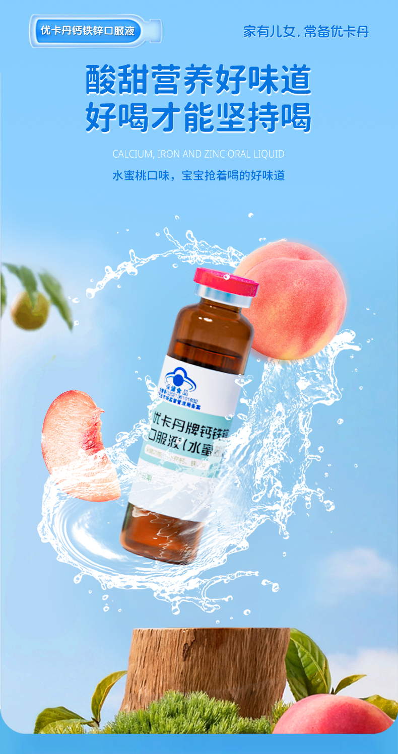 產(chǎn)品名稱:優(yōu)卡丹牌鈣鐵鋅口服液(水蜜桃味)