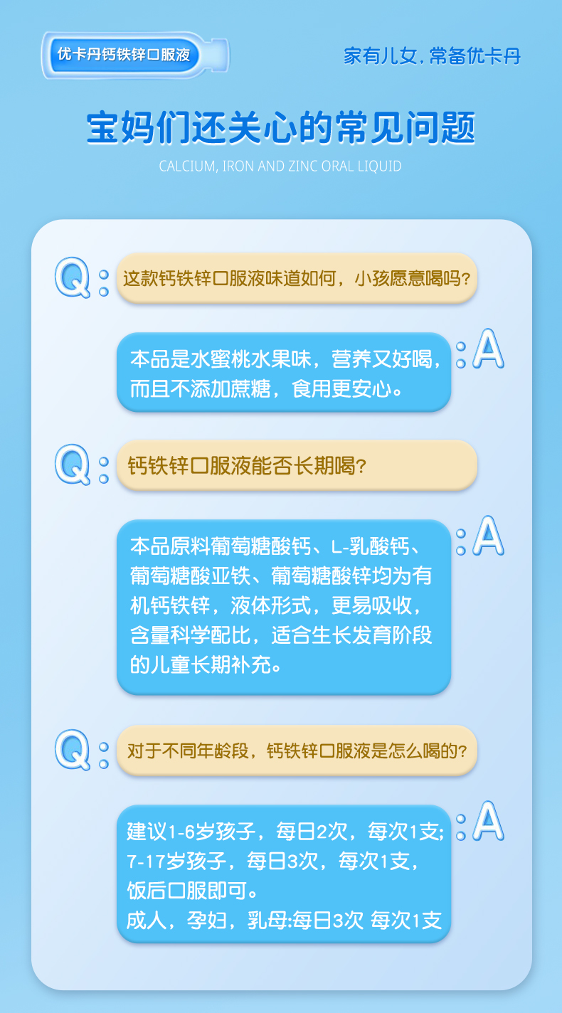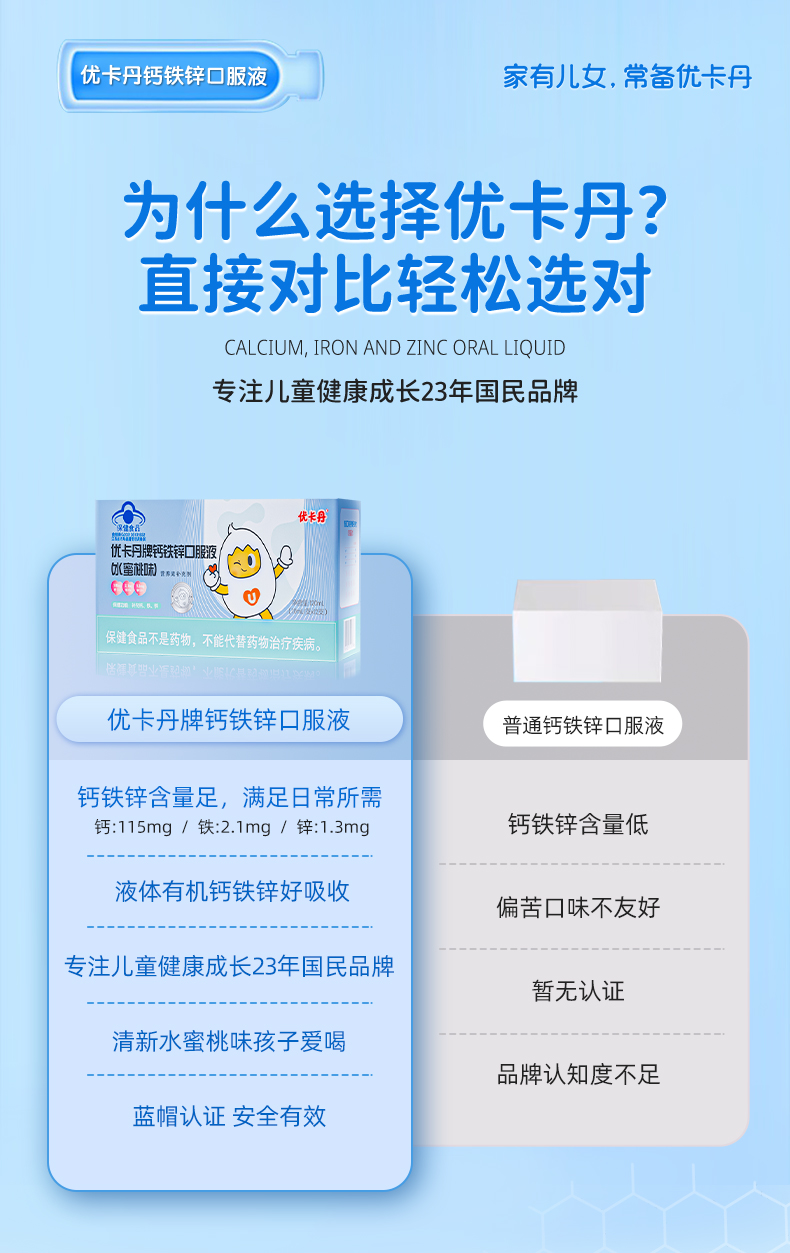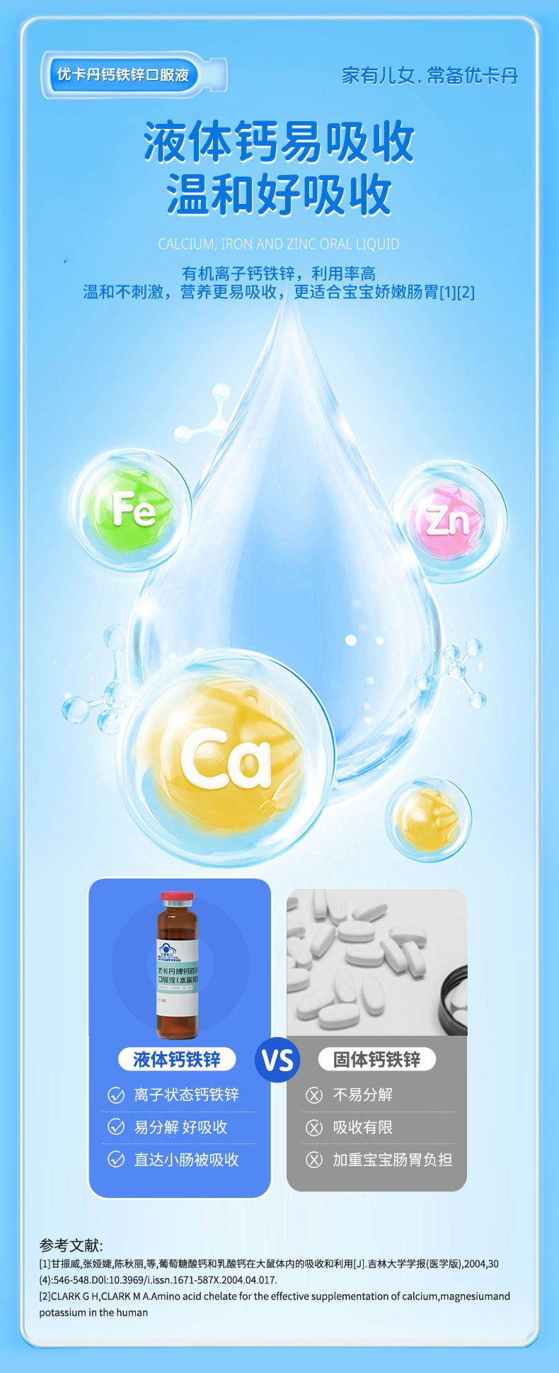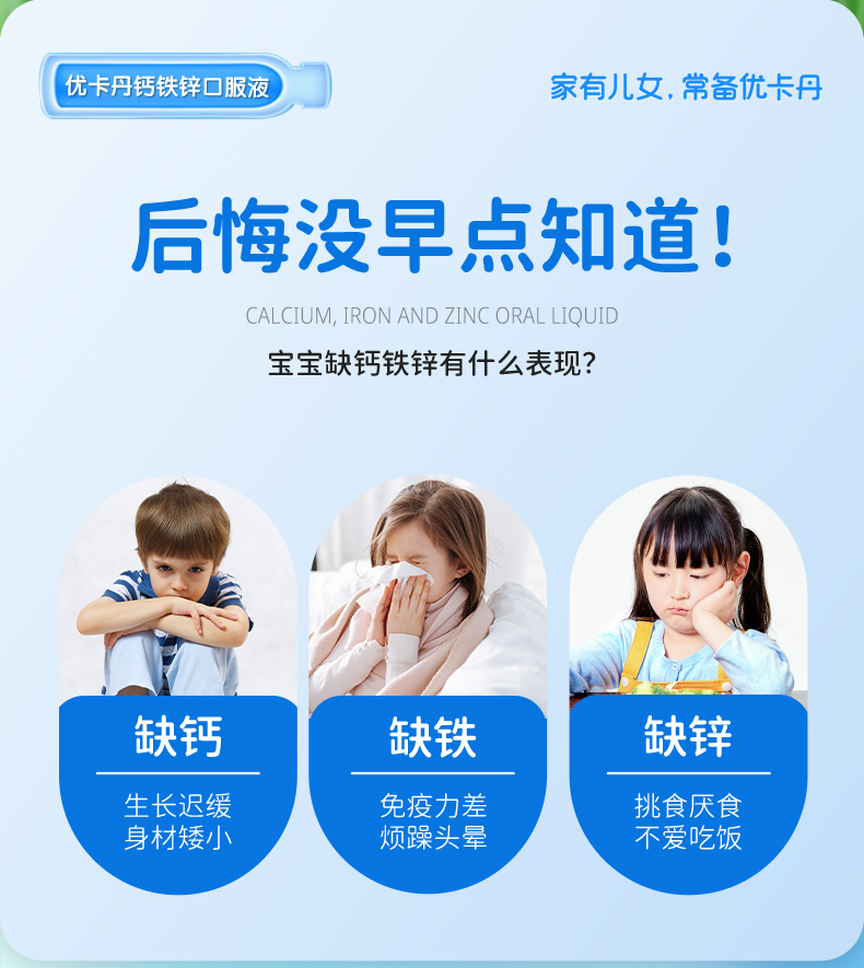 產(chǎn)品名稱:優(yōu)卡丹牌鈣鐵鋅口服液(水蜜桃味)