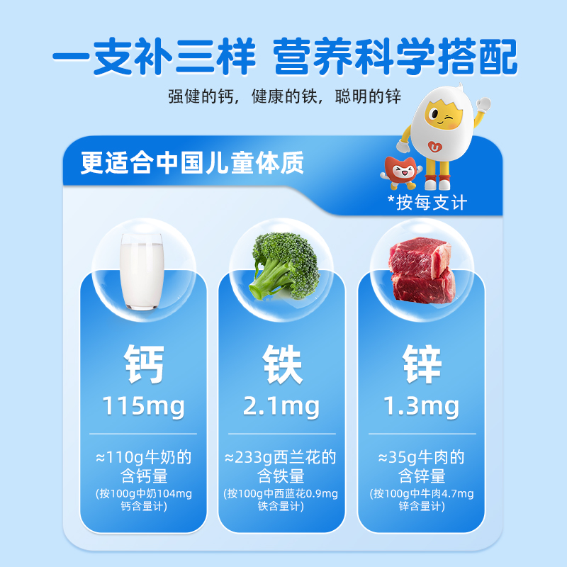 功效成分及含量:每支含:鈣115mg、鐵2.1mg、鋅1.3mg