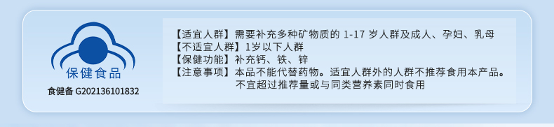 適宜人群:需要補(bǔ)充多種礦物質(zhì)的1-17歲人群及成人、孕婦、乳母