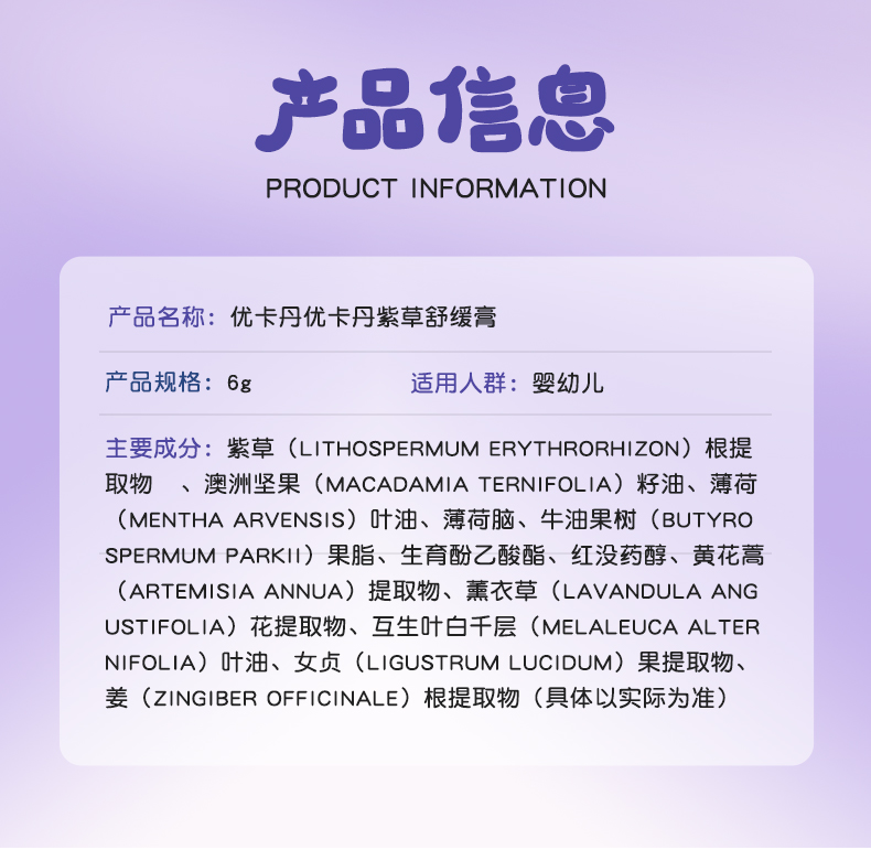 成分:礦脂、辛酸/癸酸甘油三酯、蜂蠟、微晶蠟、石蠟、1,2-戊二醇、澳洲堅果(MACADAMIA TERNIFOLIA)籽油、薄荷(MENTHA ARVENSIS)葉油、薄荷腦、牛油果樹(BUTYROSPERMUM PARKII)果脂、生育酚乙酸酯、雙-二甘油多?;憾狨?2、紫草(LITHOSPERMUM ERYTHRORHIZON)根提取物