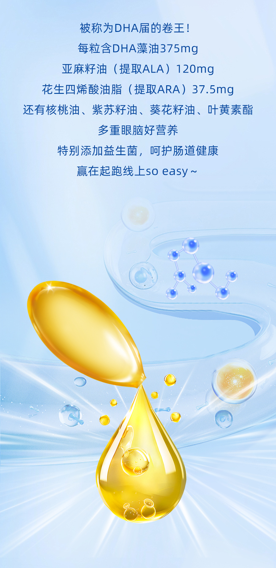 內(nèi)料:DHA藻油375mg/粒 、亞麻籽油120mg/粒 、核桃油、花生四烯酸油脂37.5mg/粒 、紫蘇籽油、檸檬油、乳酸菌后生元粉(麥芽糊精、植物乳植桿菌RH03147、植物乳植桿菌HCS03-001、羅伊氏粘液乳桿菌HCS02-001)、葉黃素酯油懸液(葵花籽油、葉黃素酯)