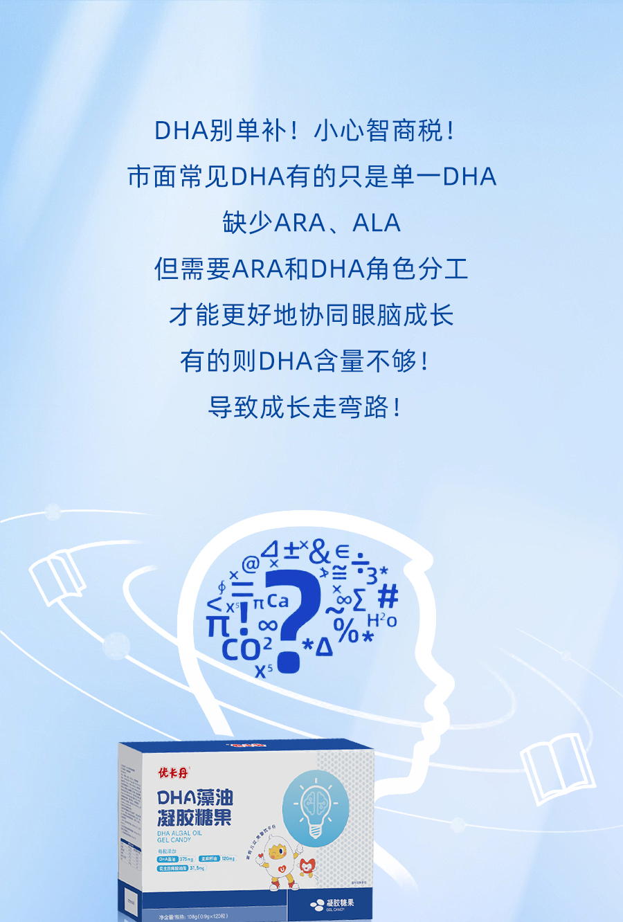 【營養(yǎng)成分含量】每粒含DHA藻油375mg、亞麻籽油120mg、花生四烯酸油脂37.5mg/粒