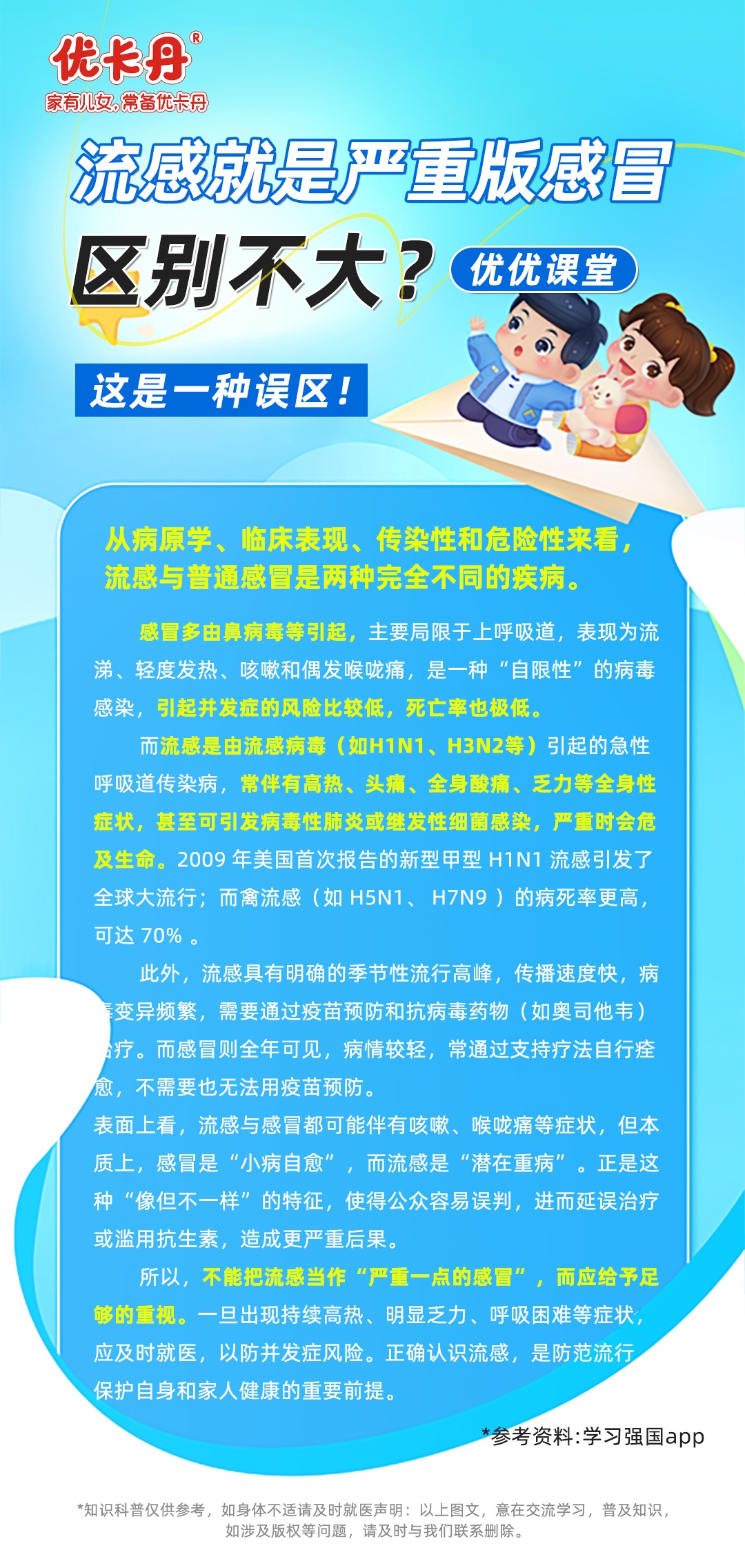 不少家長將流感簡單等同于 “嚴重版感冒”,這種認知偏差可能延誤孩子的病情處置。在優卡丹 “優優課堂”,我們從病原學、臨床表現、傳染性及危險性等維度,為您系統剖析流感與普通感冒的本質差異。掌握科學辨別邏輯,才能及時采取精準防護與干預措施,為孩子的健康成長筑牢防線。點擊深入閱讀,讓 “家有兒女,常備優卡丹” 的守護更具專業底氣。
