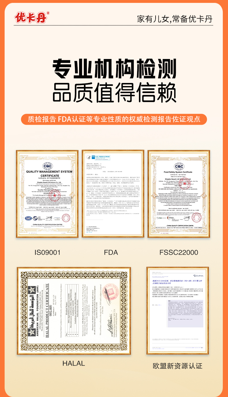 給孩子選營養品,靠譜二字最讓家長安心。優卡丹DHA 藻油+ ARA凝膠糖果不僅通過了 ISO9001、FDA、FSSC22000 等國際權威檢測認證,還手握3項中國專利,從配方研發到生產技術都經過專業驗證。