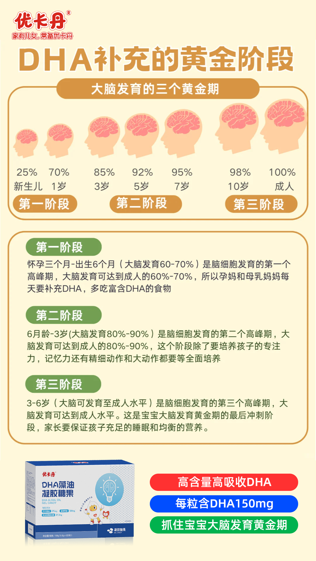 DHA補(bǔ)充圖解|一張圖帶你了解補(bǔ)充DHA的關(guān)鍵期 發(fā)布時(shí)間:2025-11-05 11:23:13 瀏覽量:64 您知道嗎?寶寶大腦發(fā)育的黃金期,一生只有一次。從出生到3歲,大腦發(fā)育將完成成人大腦的近90%,這是一個不可逆的迅猛過程。在此階段為寶寶及時(shí)補(bǔ)充足量的DHA,就如同為他鋪設(shè)最關(guān)鍵的“聰明基石”,這份早期的營養(yǎng)投入,將轉(zhuǎn)化為他未來探索世界的無限潛能。家有兒女,常備優(yōu)卡丹。